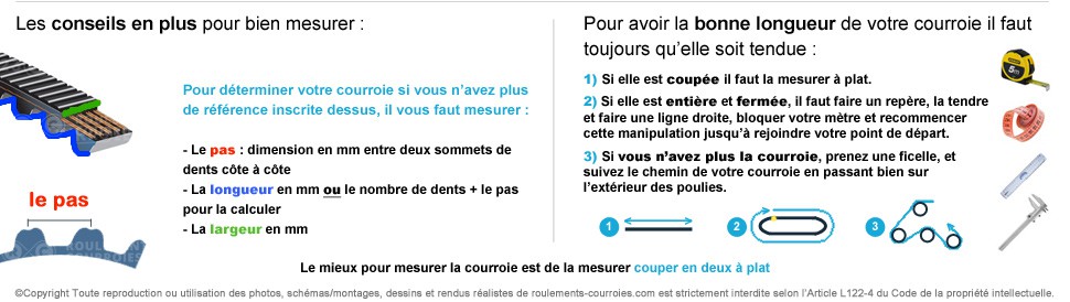 Exemple de référence : 248-8MGTPC12 / 248=longueur (mm), 8MGTPC=pas, 12=largeur (mm).